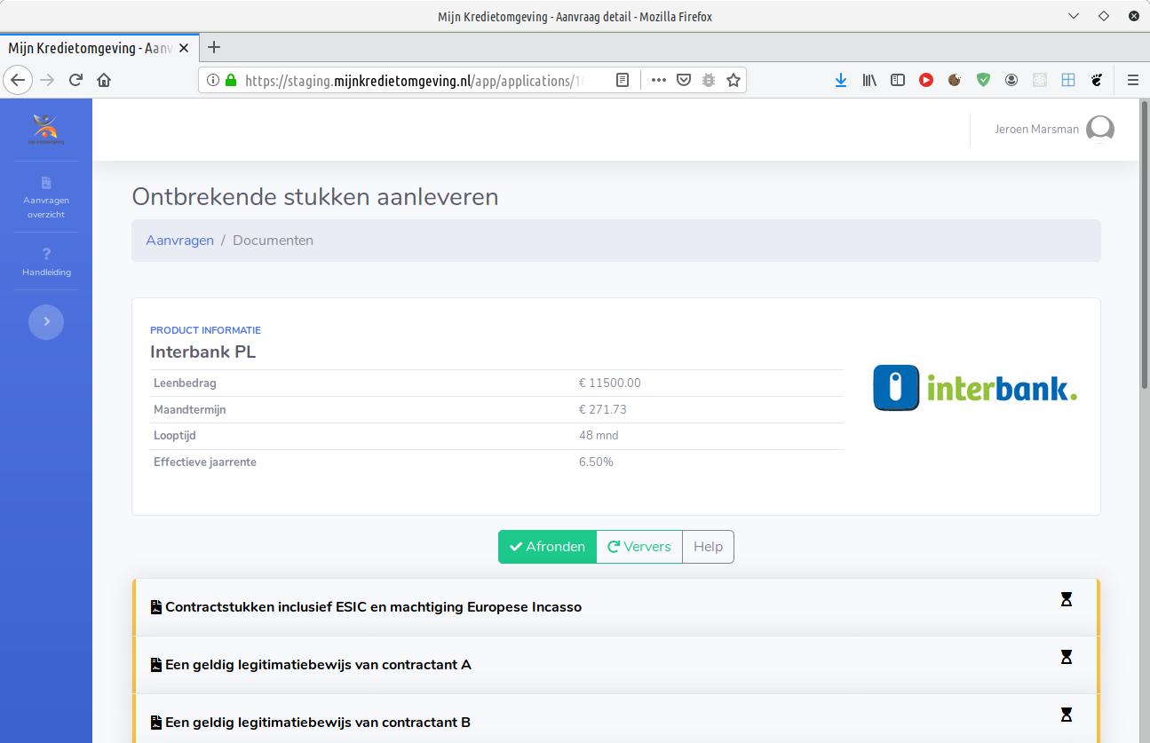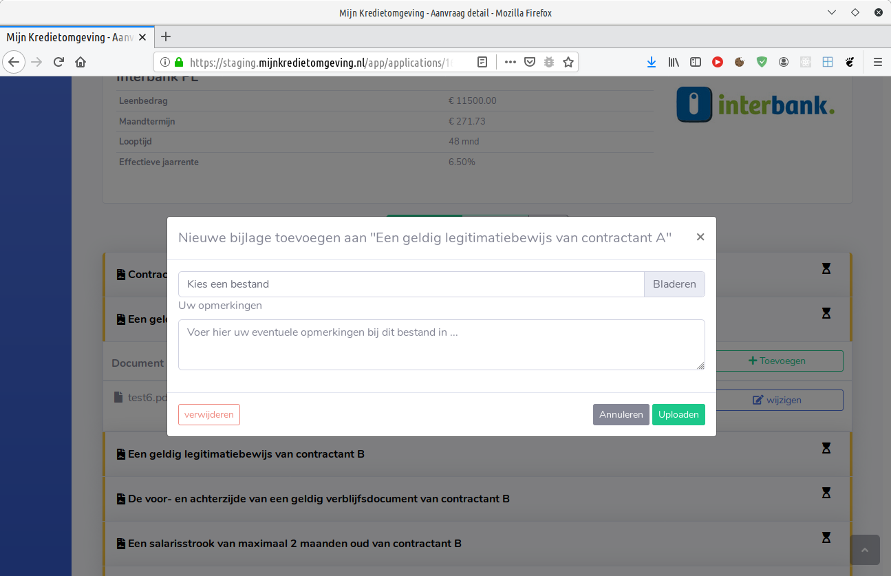 Mijn Kredietomgeving toont een overzicht van de documenten die nog aangeleverd moeten worden. Per gevraagd document is het mogelijk om een of meerdere bijlagen toe te voegen. Dit kunnen bijvoorbeeld de voor en achterkant van een legitimatiebewijs zijn, of een bankafschrift.