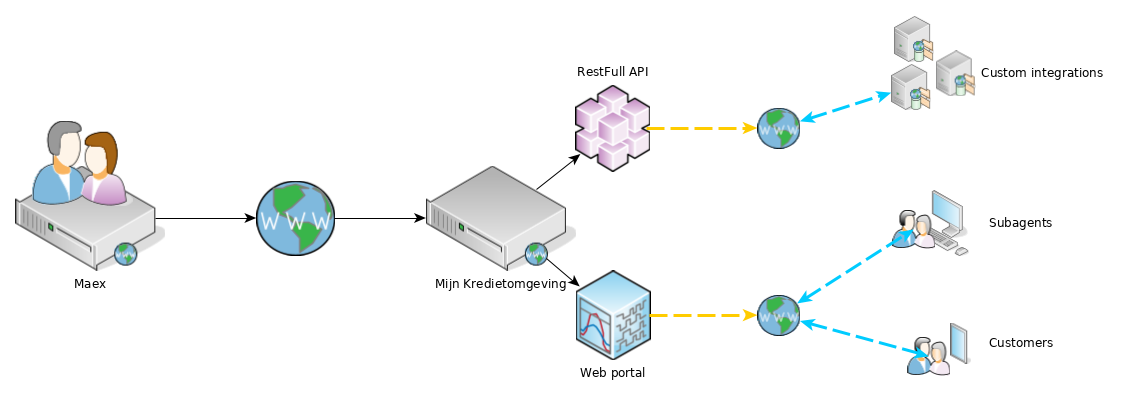 Het portaal van Mijn Kredietomgeving is een webapplicatie waarmee Maex aanvragen kunnen worden bedient. Elk aangesloten kantoor krijgt een volledig eigen omgeving van waaruit een verbinding opgezet wordt naar Maex.